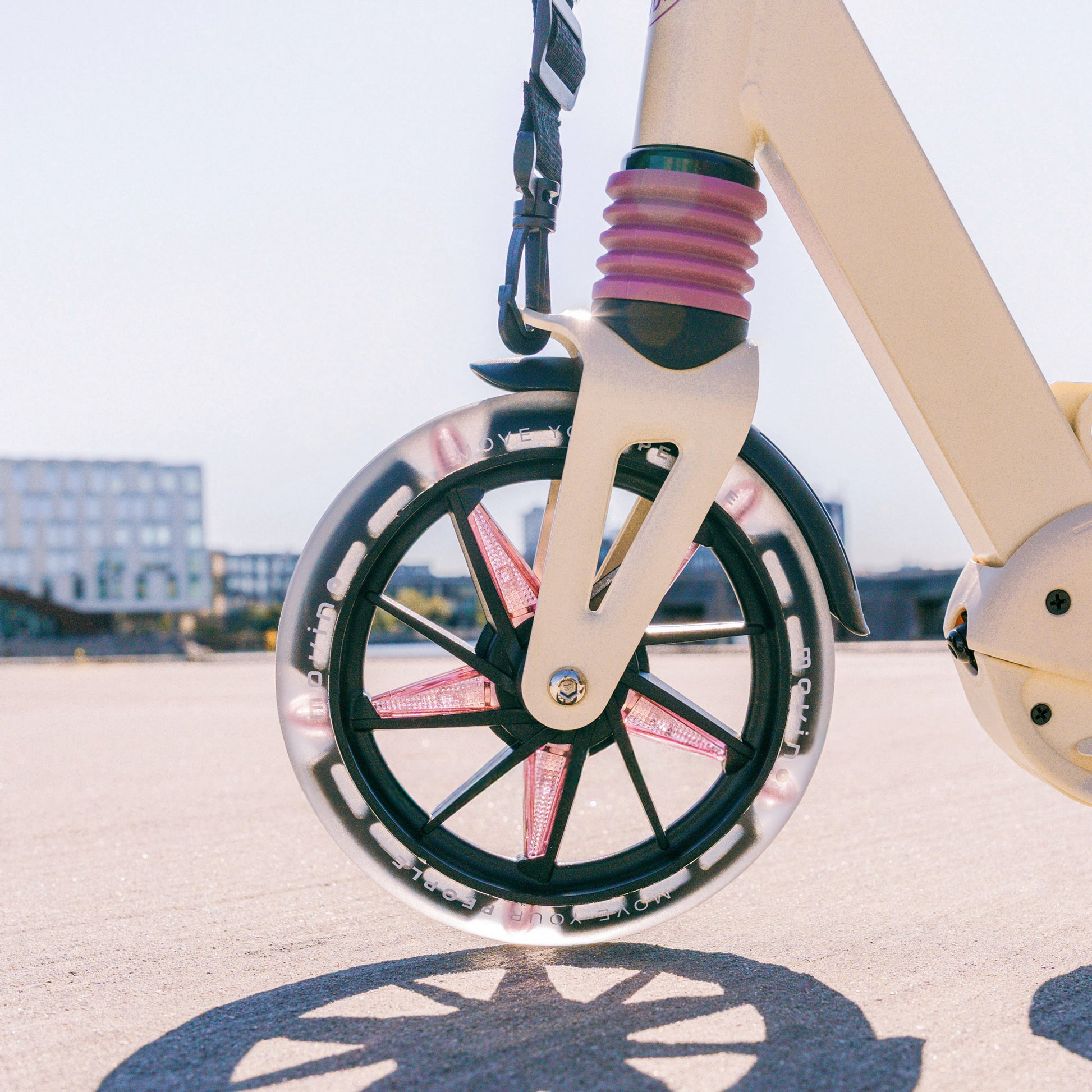 I doppi LED nel nucleo e nello strato in PU illuminano ogni rotazione della ruota. Maggiore è la velocità, più forte è l'effetto luminoso – piena luminosità e uno stile che attira l'attenzione. Il Movino City Light non solo ha un aspetto sorprendente, ma si prende cura anche della sicurezza – sei visibile da lontano, anche dopo il tramonto.