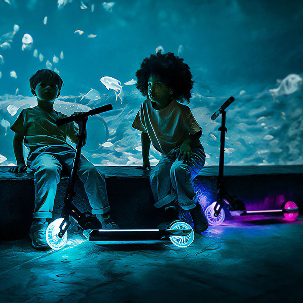 Le luci del monopattino Cosmo2 sono visibili anche durante il giorno con tempo soleggiato. Non tutti i monopattini possono vantare questa caratteristica. Di solito, i LED non producono un effetto così spettacolare e funzionano solo quando il monopattino è in movimento. Cosmo2 si illumina anche quando è fermo. Basta premere un pulsante. Le luci sono alimentate da batterie AA.