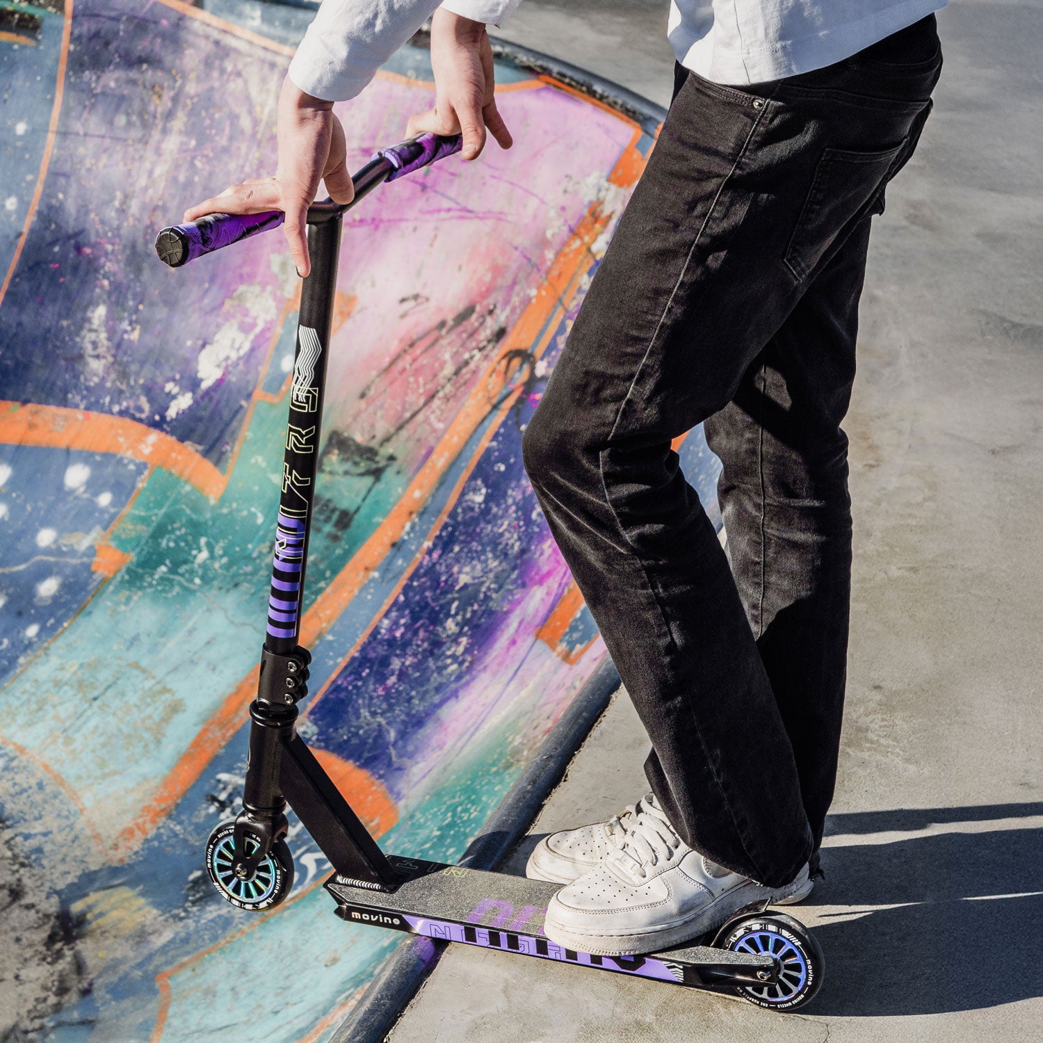 Il Movino Nitro Purple non è solo una configurazione perfettamente ottimizzata per i tuoi primi voli nello skatepark, ma presenta anche una verniciatura elegante sul deck, sui manubri e sulle ruote in un viola regale. Oggi inizi a imparare; domani sarai il re dello spot!