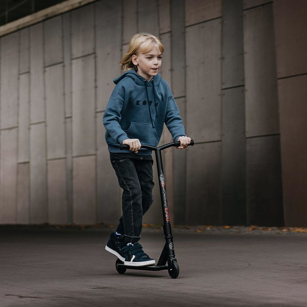 Il tuo giovane rider è pronto per lo skatepark? Ti consigliamo il monopattino Movino Tyro. Le sue caratteristiche, sviluppate in collaborazione con i rider del Team Movino, e il suo design elegante disponibile in quattro versioni, parlano da soli. Il set nero elegante con accenti rossi e l'iconico teschio Movino aggiunge un tocco di serietà a ogni trick! Con il Tyro, anche il tuo primo monopattino può combinare un look stiloso con la qualità.
