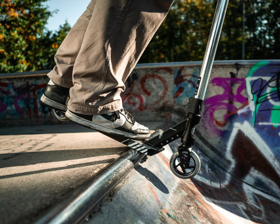 L'X-Core vanta headset integrati, un sistema di compressione IHC e ruote da 110 mm con nucleo in alluminio e cuscinetti ABEC9, tutti elementi che contribuiscono alle sue prestazioni superiori. Il manubrio a forma di Y è stato accorciato a 59 cm, offrendo un controllo e una stabilità migliorati. L'X-Core è progettato per rider avanzati che affrontano rampe e rail con disinvoltura.